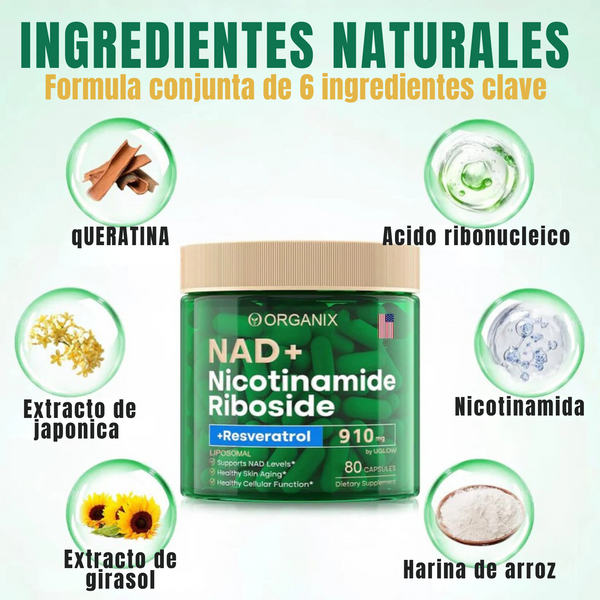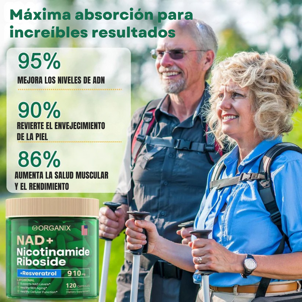 Nuestra fórmula con NAD y Resveratrol revitaliza tu cuerpo, proporcionando energía duradera y reduciendo la fatiga diaria. Despierta cada día con vitalidad y aprovecha al máximo cada momento.